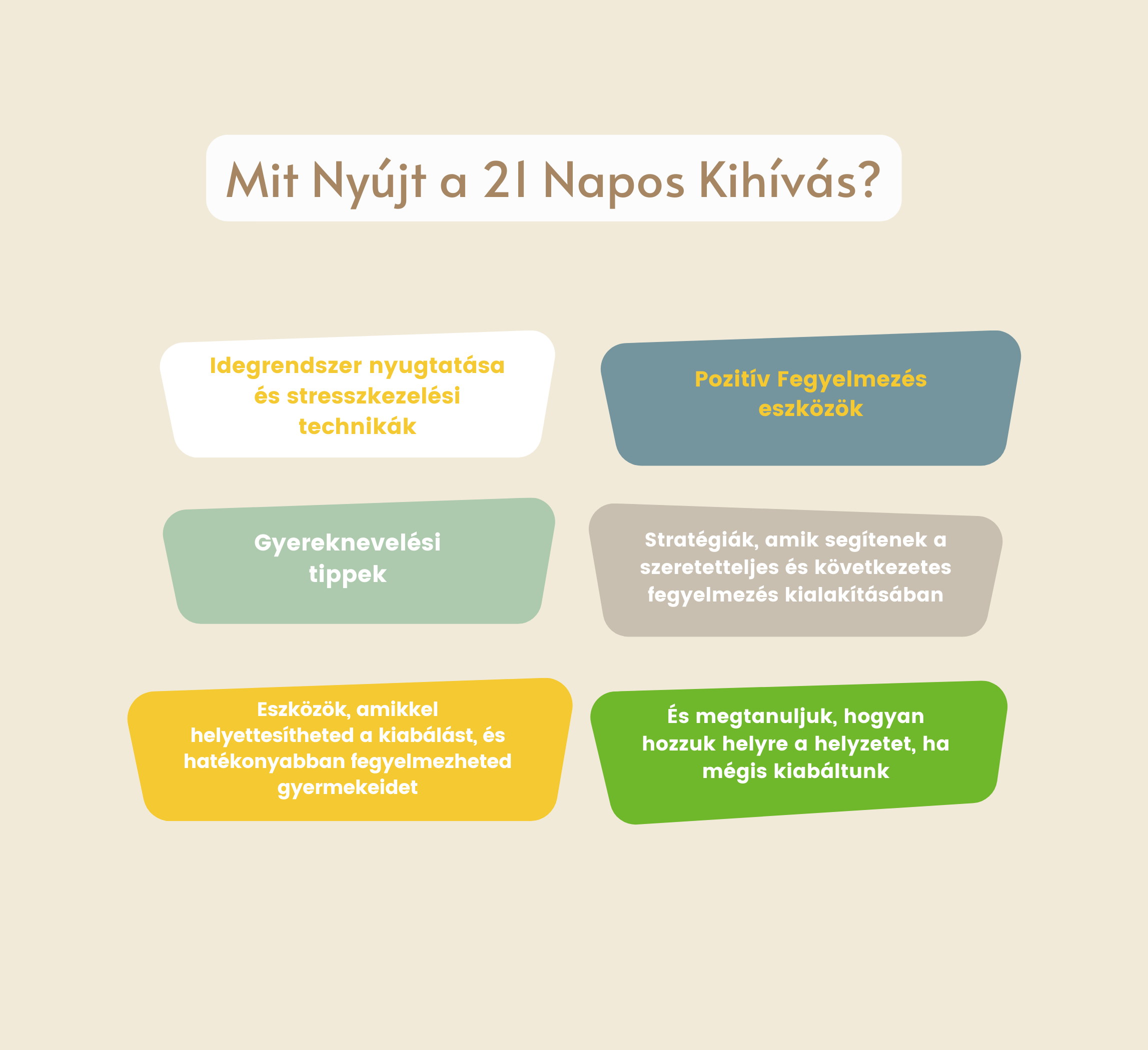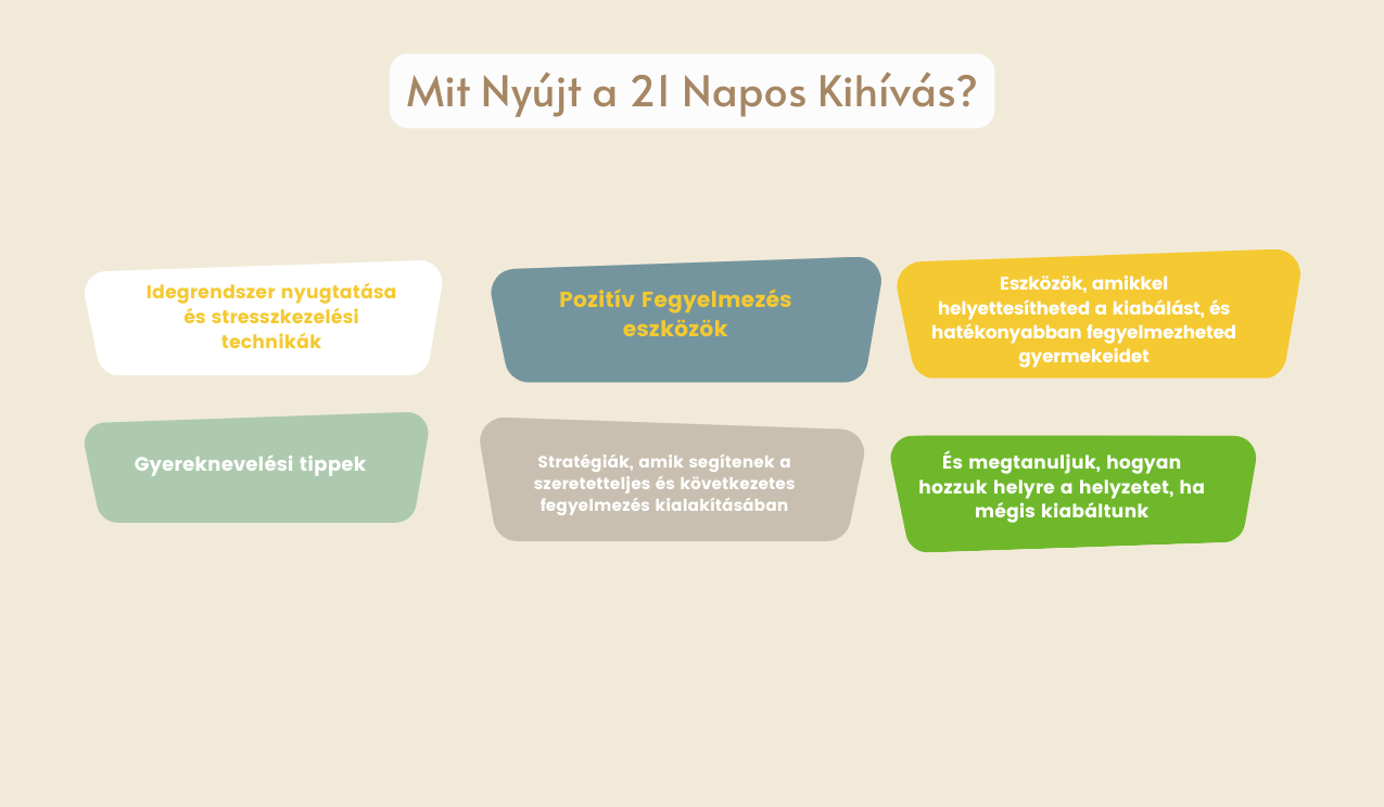 21 napon keresztül minden nap vagy videós, vagy írásos tananyag formájában megtanulunk egy eszközt vagy technikát. A 21. nap végére képes leszel arra, hogy minimalizáld a kiabálást a családodban.
